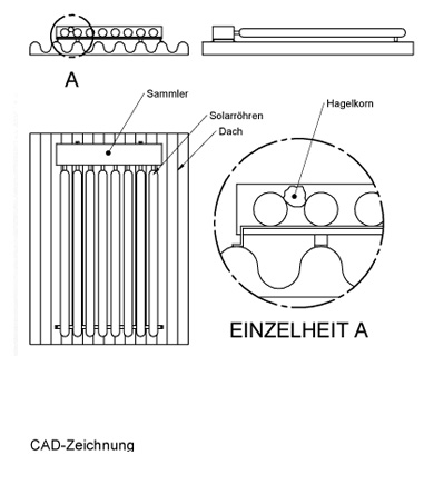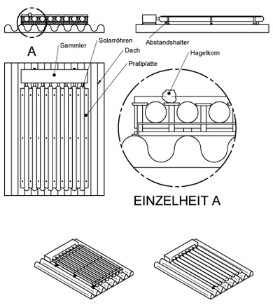 Der patentierte Hagelschutz besteht aus mehreren Prallplatten aus einem durchsichtigen, schlagfesten Kunststoff. Diese werden mit ebenfalls durchsichtigen Abstandshaltern zwischen den einzelnen Solarröhren angebracht.