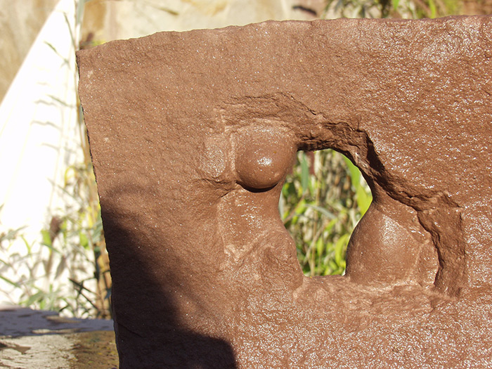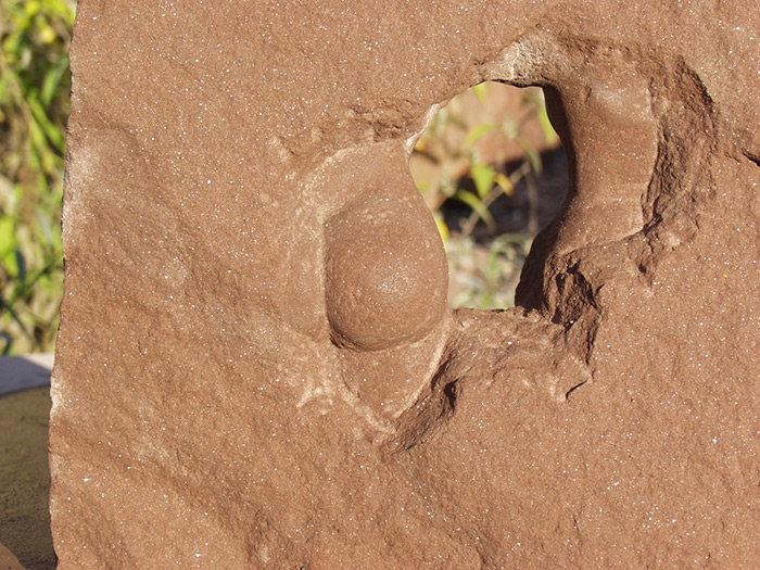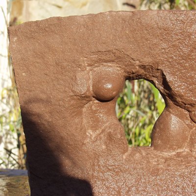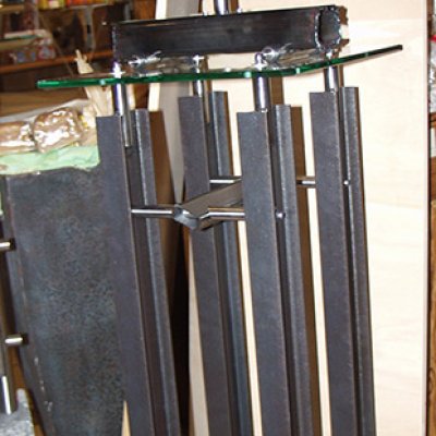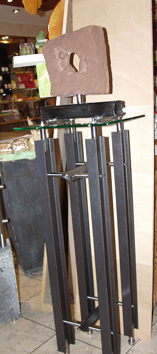 Format: 150x40x40cm, Material: Pfinztäler Sandstein Edelstahl Stahlträger Glas drehbarer Sockel