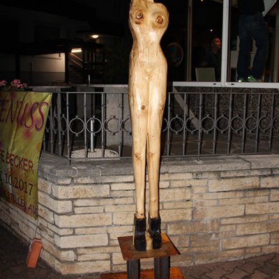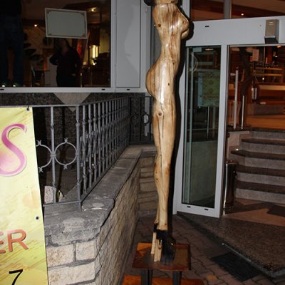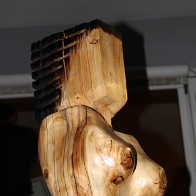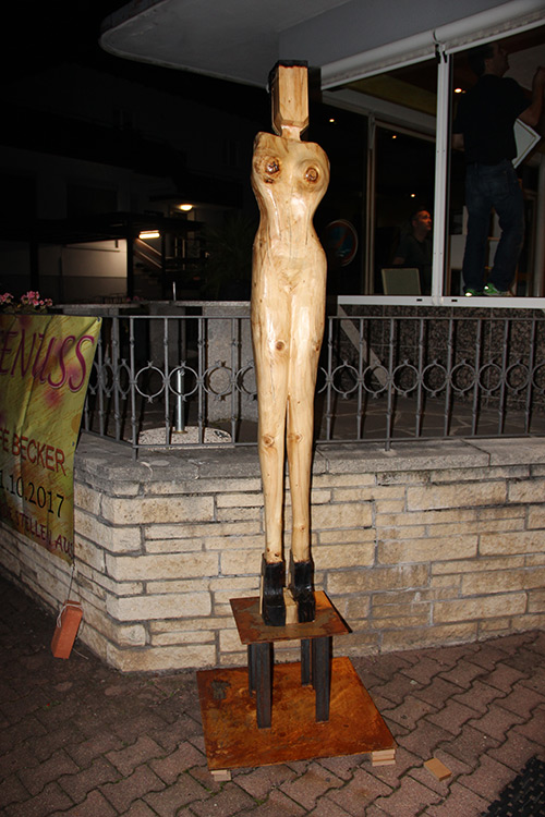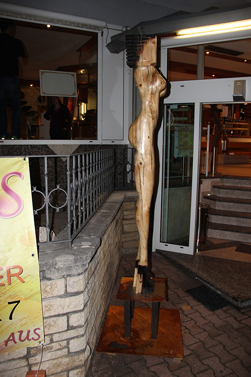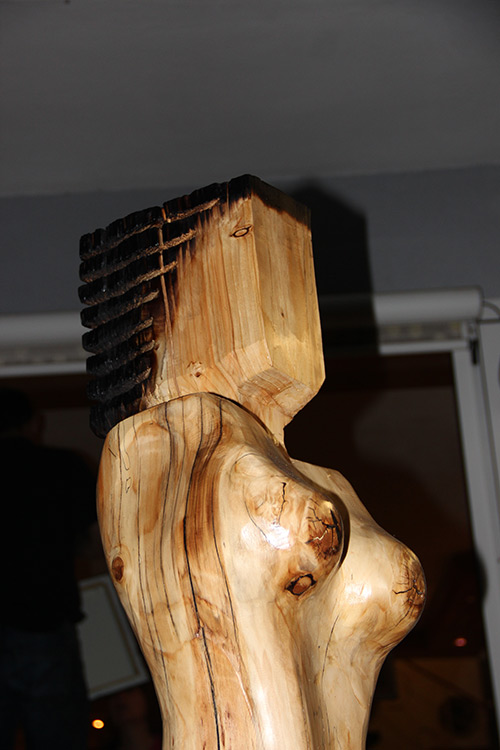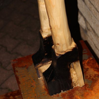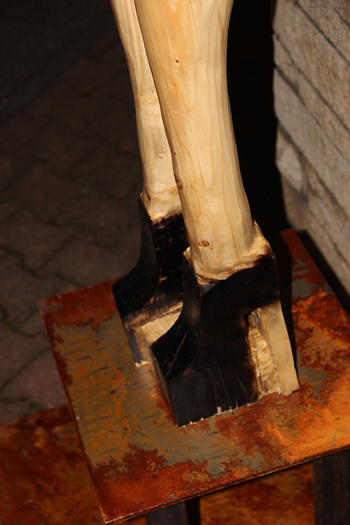 Format: 300x50x50cm, Material: gestocktes Tannenholz mit Flamme geschwärzt auf Stahlsockel